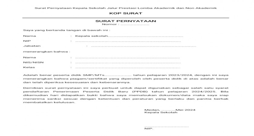 Surat Pernyataan Kepala Sekolah Jalur Prestasi Lomba Akademik - Non Akademik